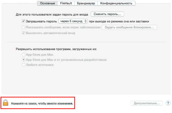 2. Во вкладке Основные нажмите на замок в нижнем левом углу
